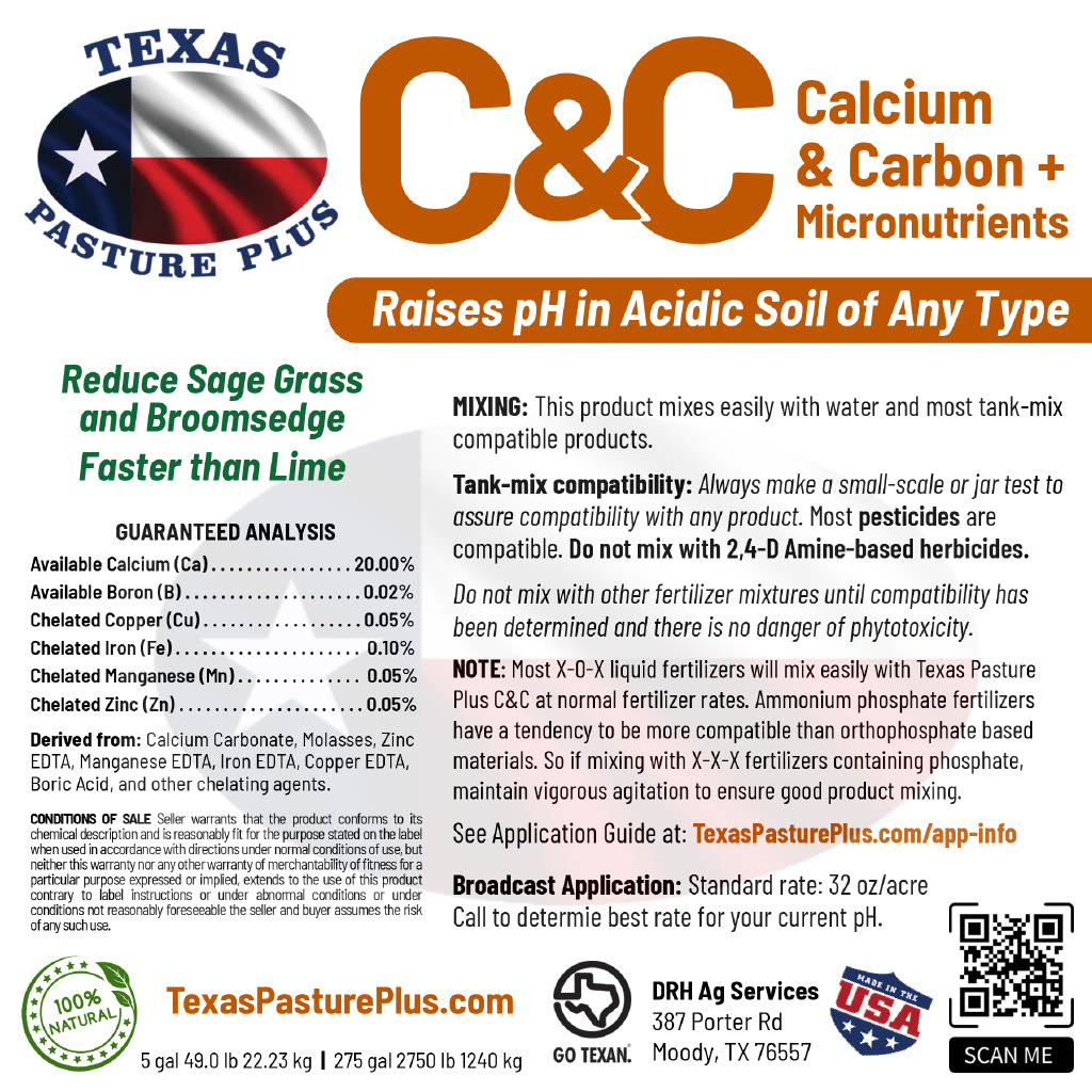With all the liquid lime out there. We decided to change our formula and add Carbon. This gives us C & C. The only liquid calcium on the market with carbon to feed your microbes and soil at the same time as raising your PH for as low as $15.00 per acre. Much lower application rates than other products on the market. And provide you your plants and soil with carbon for an extra boost adding calcium alone will never give you. We should be able to change your PH by 1 % with a quart to the acre in less than 7 days.